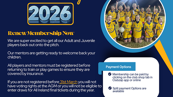 For all other membership types, if you are not registered before 31st March you will not have voting rights at the AGM or you will not be eligible to enter membership draws for All Ireland Final Tickets during the year.
